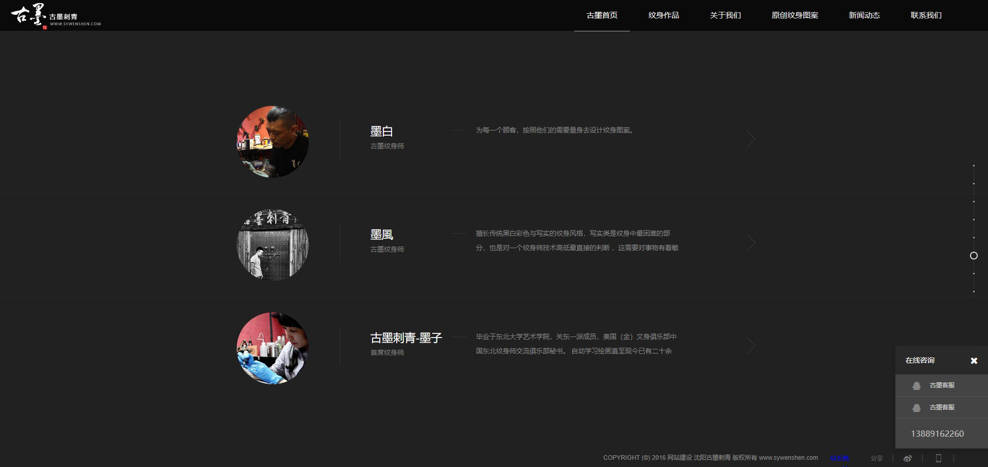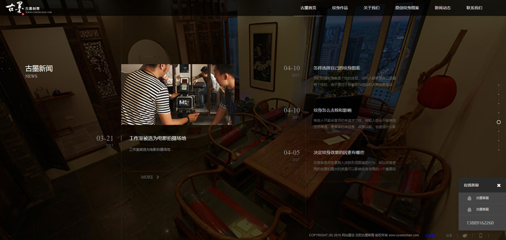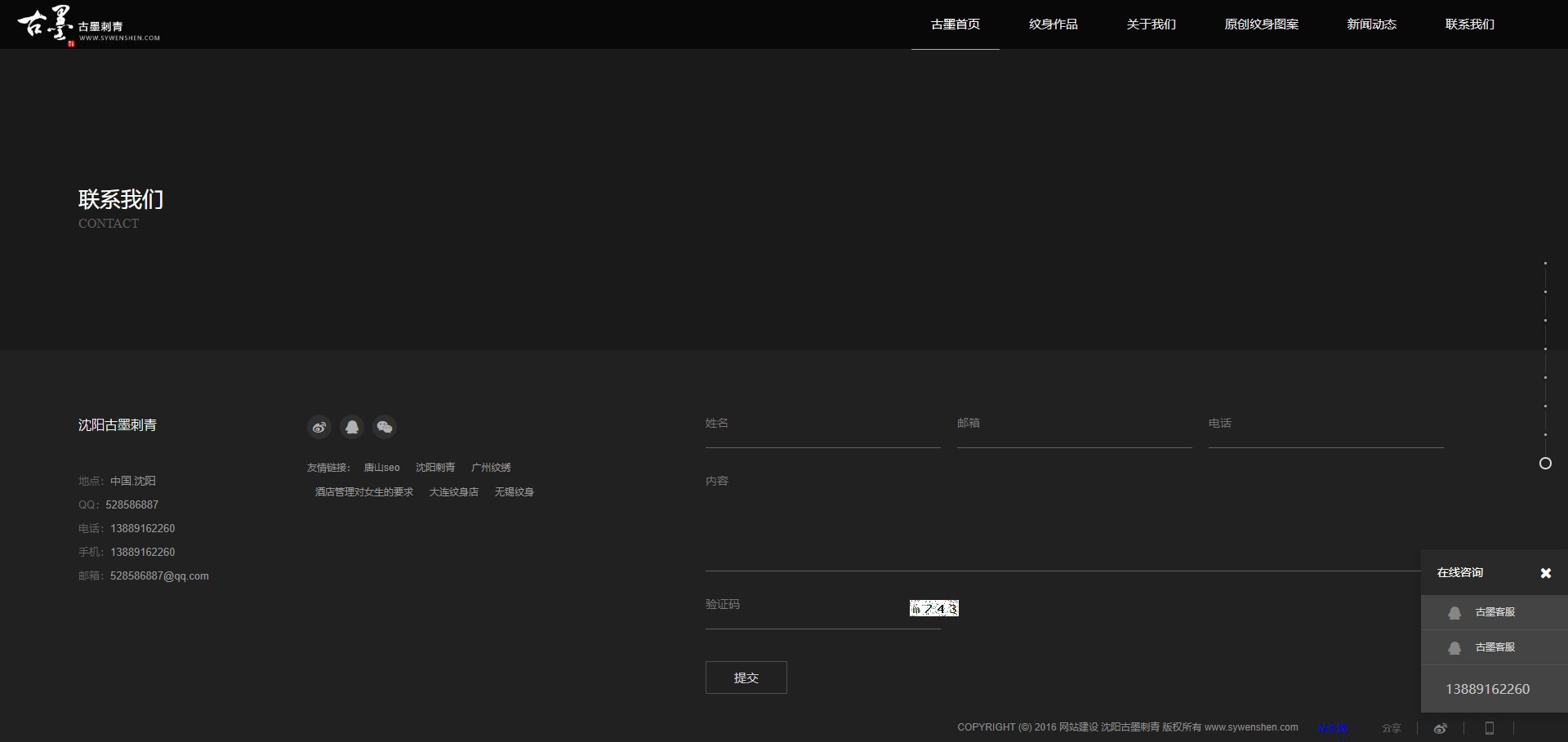 沈陽古墨刺青紋身機構---是沈陽著名的紋身設計機構 提供全方位刺青設計及相關服務 主要從事專業紋身,無痛紋身,洗紋身,失敗紋身修改,疤痕胎記遮蓋,以及專業紋身培訓等。