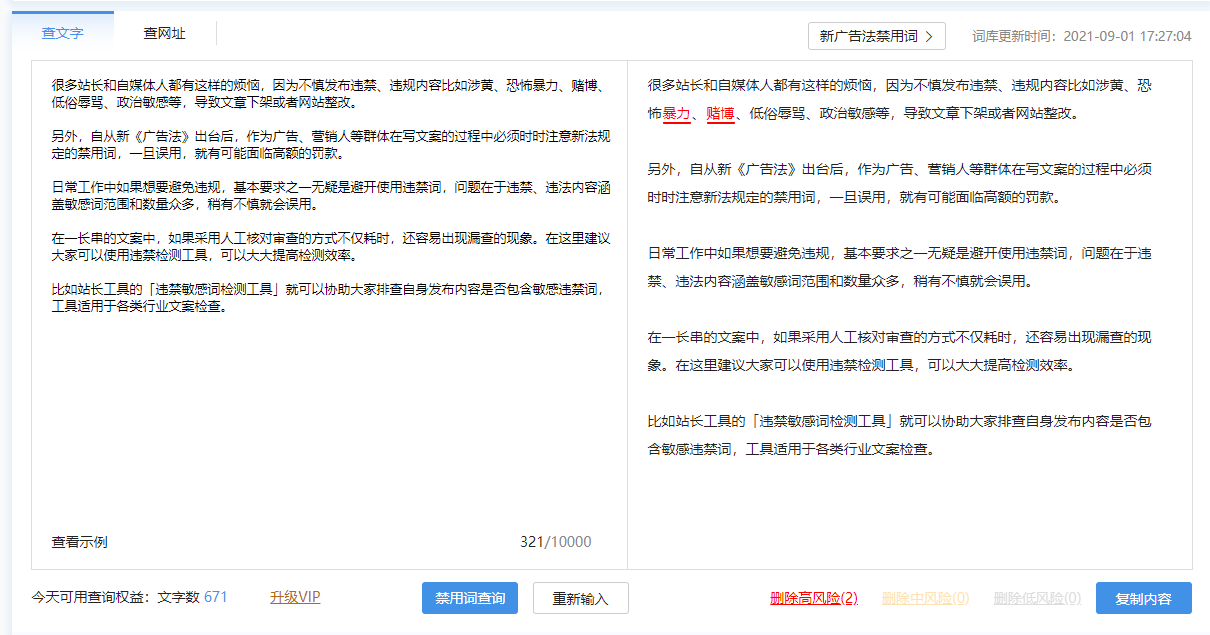 比如站長工具的「違禁敏感詞檢測工具」就可以協助大家排查自身發布內容是否包含敏感違禁詞,工具適用于各類行業文案檢查。