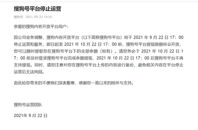 9月22日消息搜狗號今日發布公告稱,因公司業務調整,搜狗號平臺于2021年9月22日17:00停止運營和服務。即日起至2021年10月22日17:00前,平臺提現限額將會開放,用戶可隨時提取在搜狗號平臺下的全部余額。