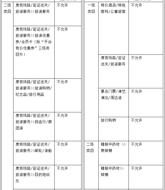 包括:“度假線路/簽證送關/旅游服務>>旅游服務”、“度假線路/簽證送關/旅游服務>>旅游優惠券/會員卡(除“平臺有價優惠券”三級類目外)”、“度假線路/簽證送關/旅游服務>>旅游購物/紀念品/旅行用品”、“度假線路/簽證送關/旅游服務>>自由行/跟團游”、“度假線路/簽證送關/旅游服務>>郵輪/游船”、“度假線路/簽證送關/旅游服務>>目的地玩樂”、“景點門票/演藝演出/周邊游>>境內周邊游”、“旅行購物>> OTC藥品/醫療器械/計生用品”、“旅行購物>> 保健食品/膳食營養補充食品”、“旅行購物>> 旅行購物合作券”。